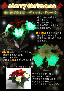 光触媒で消臭も!!♪【メーカー直送K】暗い所で光る花?ダイヤモンドローズ?クリスマスアレンジ★蓄光【フラワー】【蓄光】【バラ】【アートフラワー 造花】価格: 1,580円レビュー評価: 0.0 レビュー数:0 ★暗い所で光るバラ!!さらに光触媒で消臭も!!♪♪●暗い所で光る花、Moon Flowerのアレンジです。 ●光るバラ、ポインセチアの花とリンゴ、ベリーと光る花をクリスマスアレンジにしました。 ●明るい所で光りを蓄え、暗い所で光ります。 繰り返し何度でも半永久的に光ります。 ●さらに、光触媒の加工をしているため、消臭効果もあります。●置いておくだけで光って消臭もしてくれる、ダイヤモンドローズのアレンジです!商品の仕様サイズ約15cm×15cm×16cm規格ポリエステル、木、蓄光ブランドMoon Flower注意事項水洗いは避けて下さい*こちらはメーカー直送品となります。 在庫確認の上、あらため |